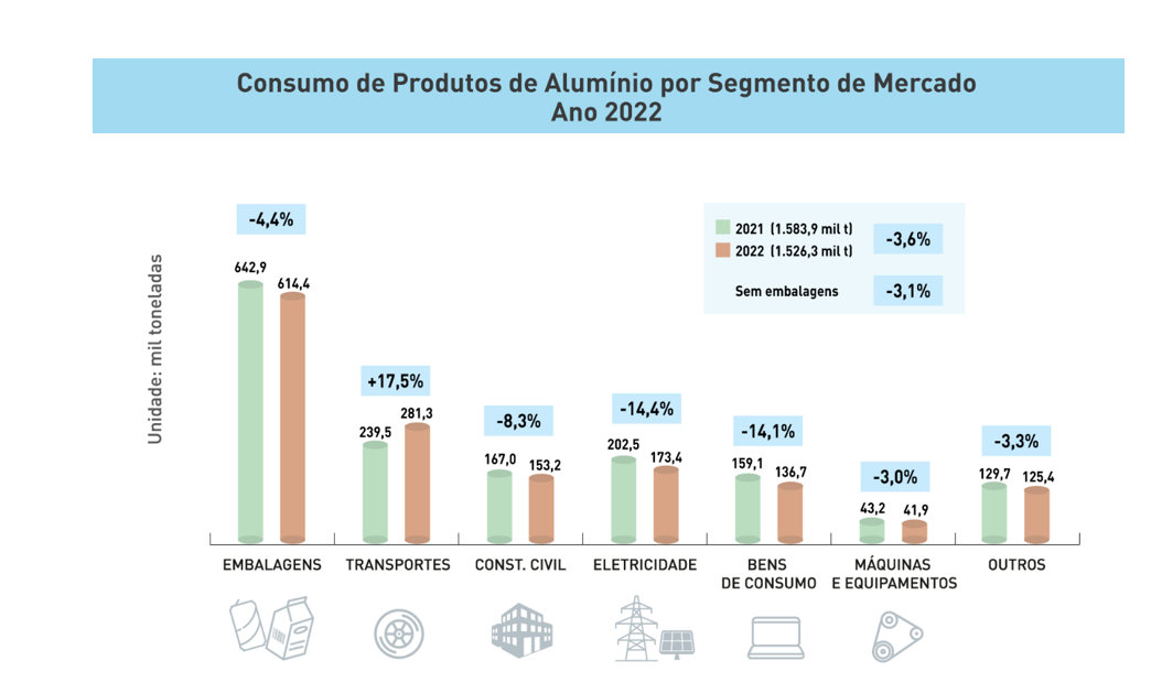 De acordo com a Associação Brasileira do Alumínio (ABAL), o consumo doméstico de produtos transformados de alumínio em 2022 registrou o volume de 1.526,3 mil toneladas, representando queda de 3,6% na comparação com o ano de 2021 (1.583,9 mil toneladas). O resultado confirma a tendência já sinalizada em levantamento divulgado pela entidade em novembro de 2022 (queda de 3,9%).