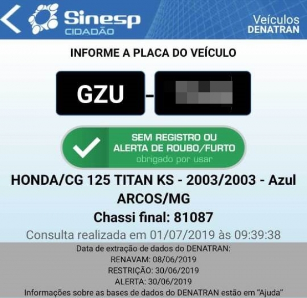 Segundo aplicativo o SINESP Cidadão, a moto não tem queixa de roubo e está em situação regular.