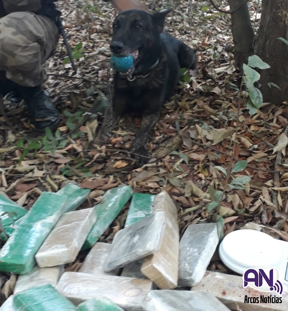 De imediato, os militares compareceram no local, e após aplicar no terreno o Cão de faro Black, da ROCCA (Ronda Ostensiva com Cães), foi localizado um tonel de plástico vazio e outro tonel contendo 32 barras de maconha, pesando cerca de 18 kg da droga e 700 gramas de pasta base de cocaína, que estavam enterrados no local.
