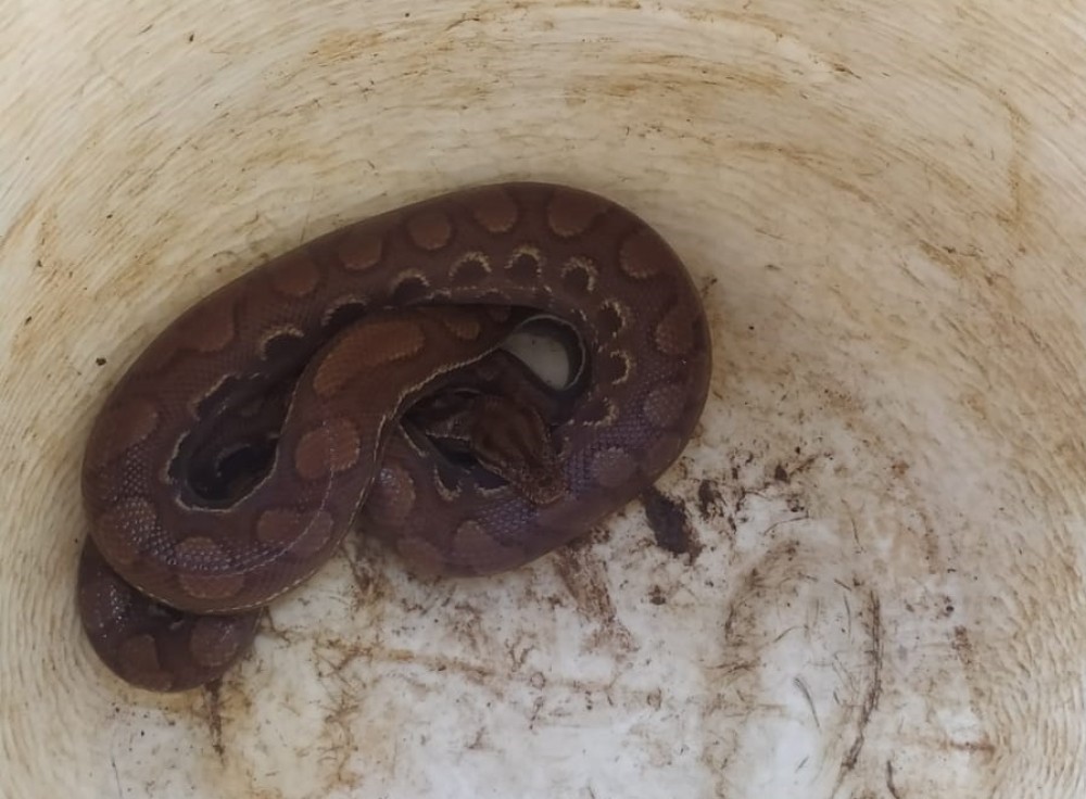 A cobra foi capturada e devidamente acondicionada em um recipiente apropriado. Durante o atendimento, verificou-se que a serpente em questão era de cativeiro e havia escapado do terrário onde estava mantida, permanecendo desaparecida por aproximadamente 42 dias.
