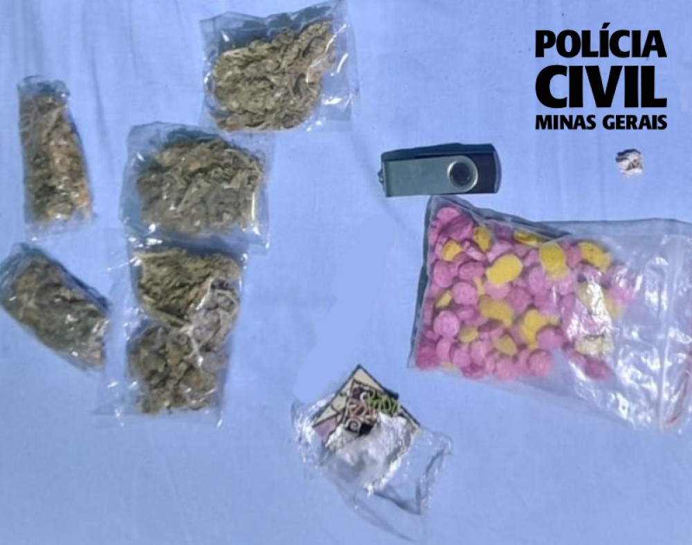 Entre os materiais apreendidos estavam 66 pontos de LSD, 86 comprimidos de ecstasy (MDMA), embalagens para armazenamento das drogas, um dichavador e um celular.