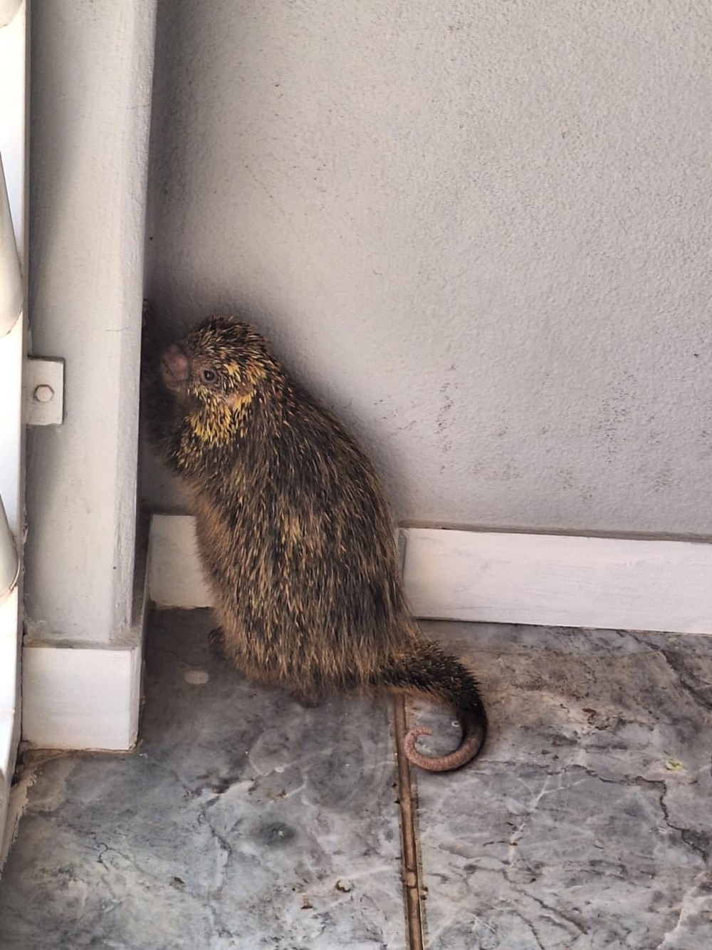 Por volta das 8h, moradores relataram a presença de um ouriço-caxeiro acuado na varanda de uma residência, gerando preocupação entre os habitantes.