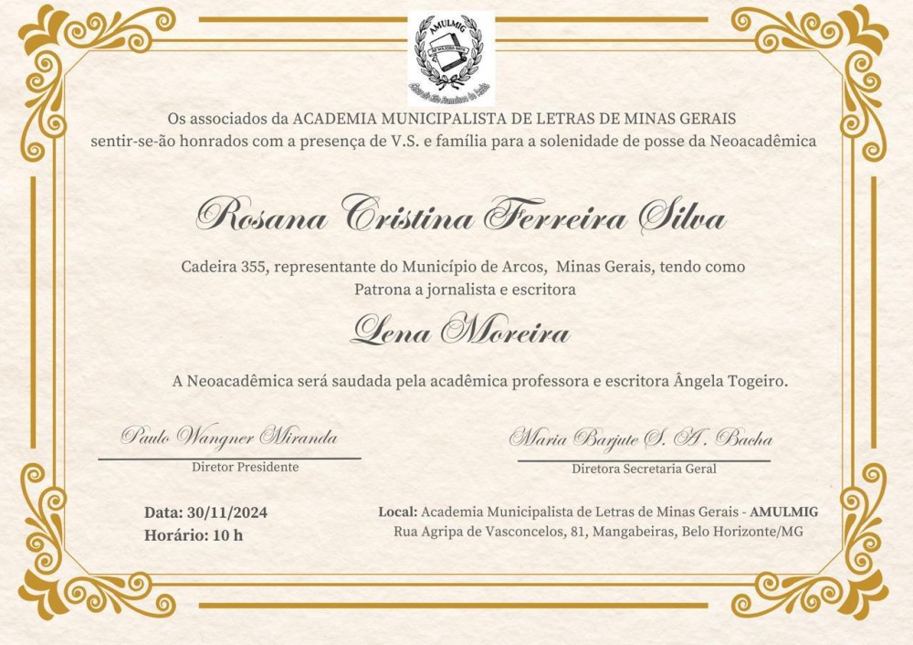 A escritora Rosana Cristina Ferreira Silva, natural de Arcos, será empossada como membro da Academia Municipalista de Letras de Minas Gerais (AMULMIG), a segunda maior academia de letras do estado e a terceira maior do Brasil. A cerimônia de posse será realizada no próximo dia 30 de novembro de 2024, às 10h, na sede da AMULMIG, situada na Rua Agripa de Vasconcelos, 81, no bairro Mangabeiras, em Belo Horizonte.