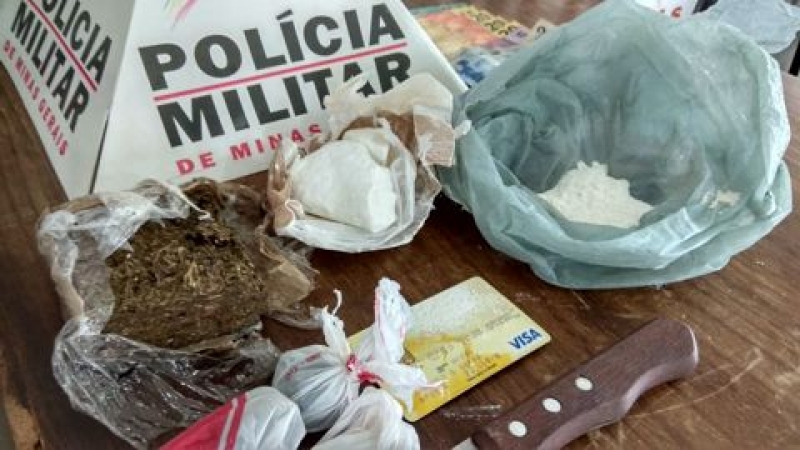 A ocorrência se iniciou com uma denúncia anônima e terminou com a apreensão de 02 buchas e 01 tablete grande de maconha, 01 porção considerável de cocaína petrificada e outra porção, da mesma substância, em pó, além de 01 faca, 03 celulares, R$211,00 em dinheiro, 01 cartão de crédito e 01 motocicleta.