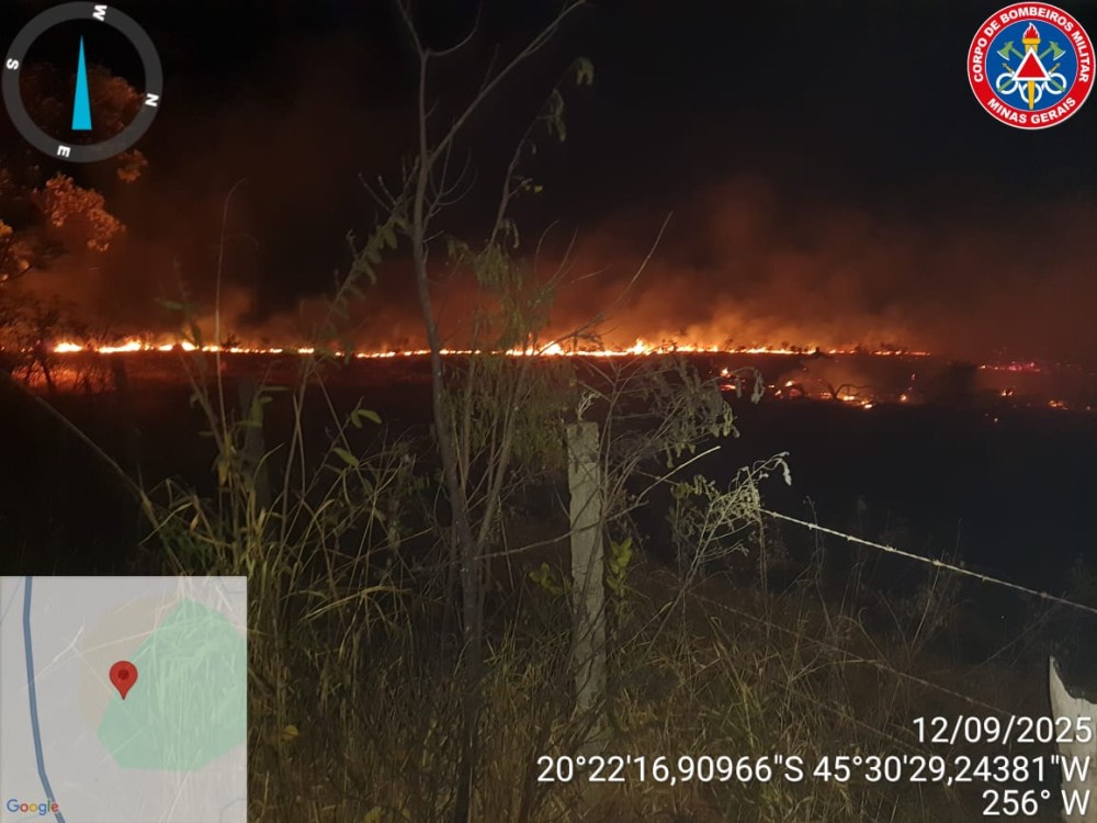 Na noite desta sexta-feira (12/09), por volta das 22h, o Corpo de Bombeiros Militar foi acionado para combater um incêndio em vegetação às margens de uma rodovia, que rapidamente se alastrou para uma extensa área de pastagem, em Arcos.