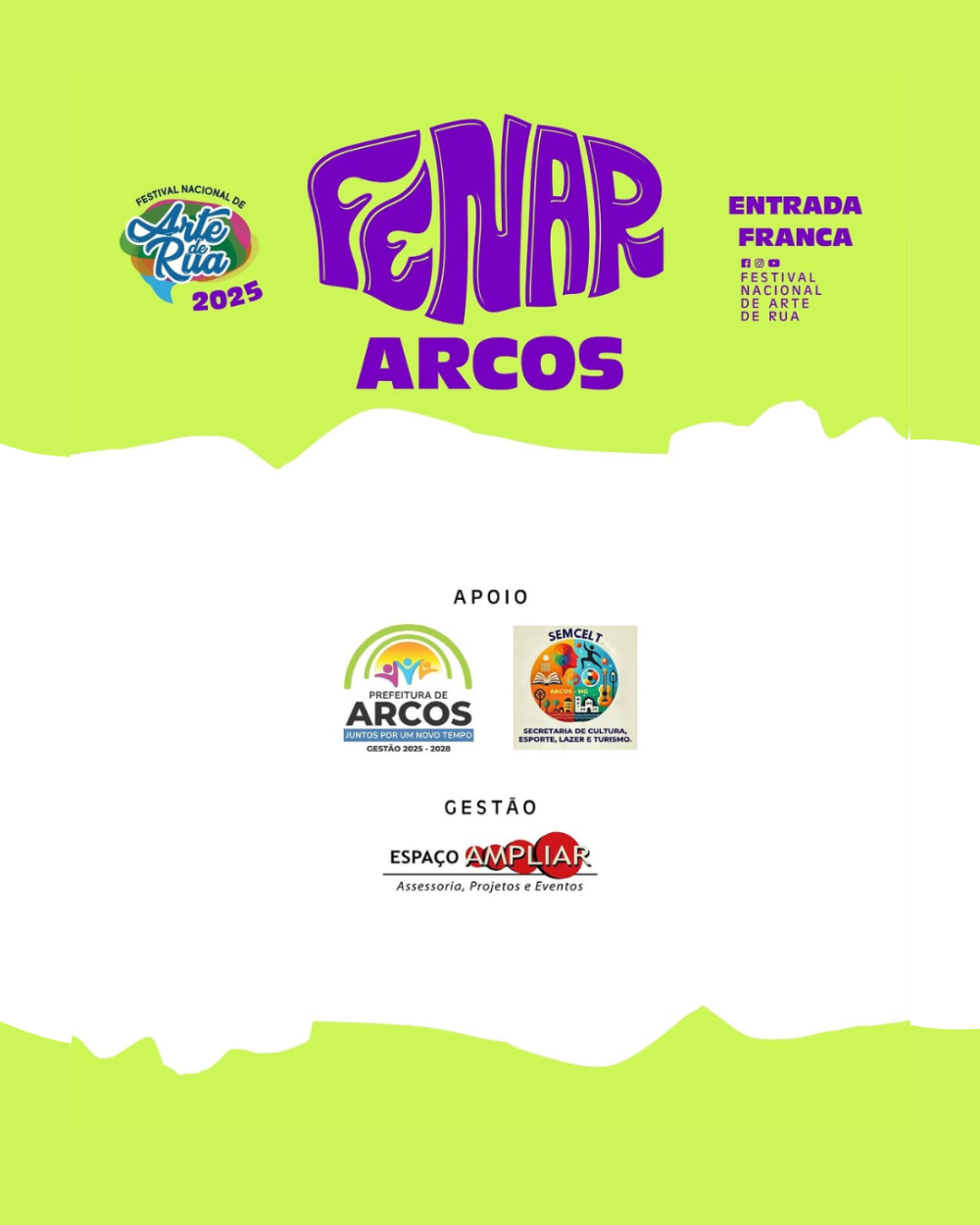 O Festival Nacional de Arte de Rua – FENAR Brasil volta a movimentar a cidade de Arcos entre os dias 3 e 9 de novembro de 2025, com entrada gratuita e uma programação ainda mais diversificada. Esta é a segunda edição do evento na cidade, consolidando o FENAR como um espaço de encontros entre linguagens e gerações, reunindo artistas locais e convidados em apresentações de música, dança, teatro, circo, literatura, cultura popular, arte visual e bate-papos.