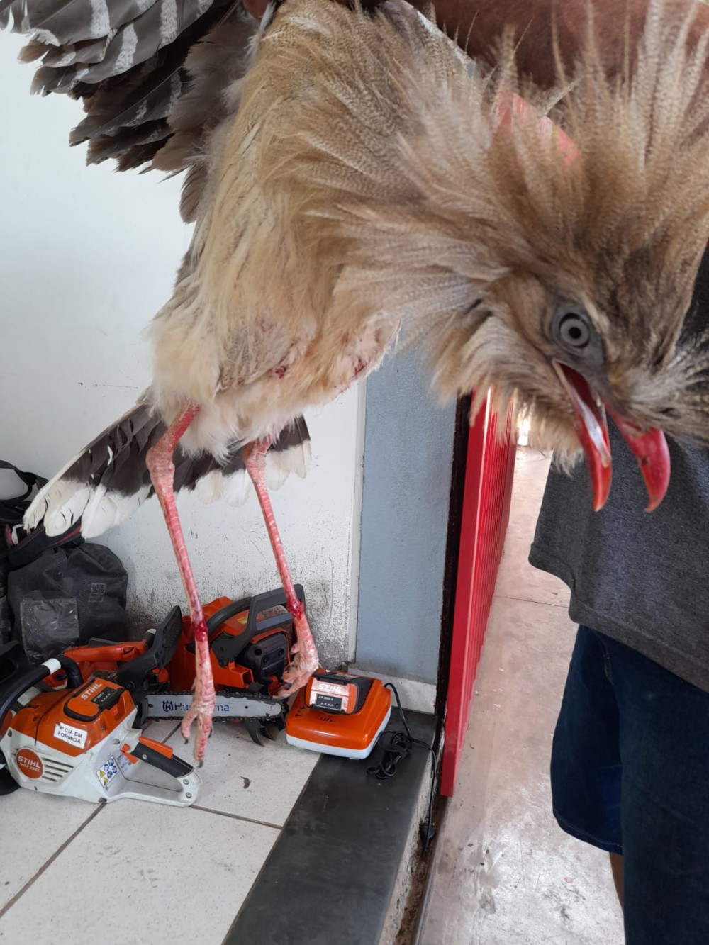 Segundo as informações repassadas à guarnição, a ave apresentava suspeita de fratura nas duas patas, motivo pelo qual foi recolhida pelo solicitante e levada até o Posto Avançado para avaliação inicial.