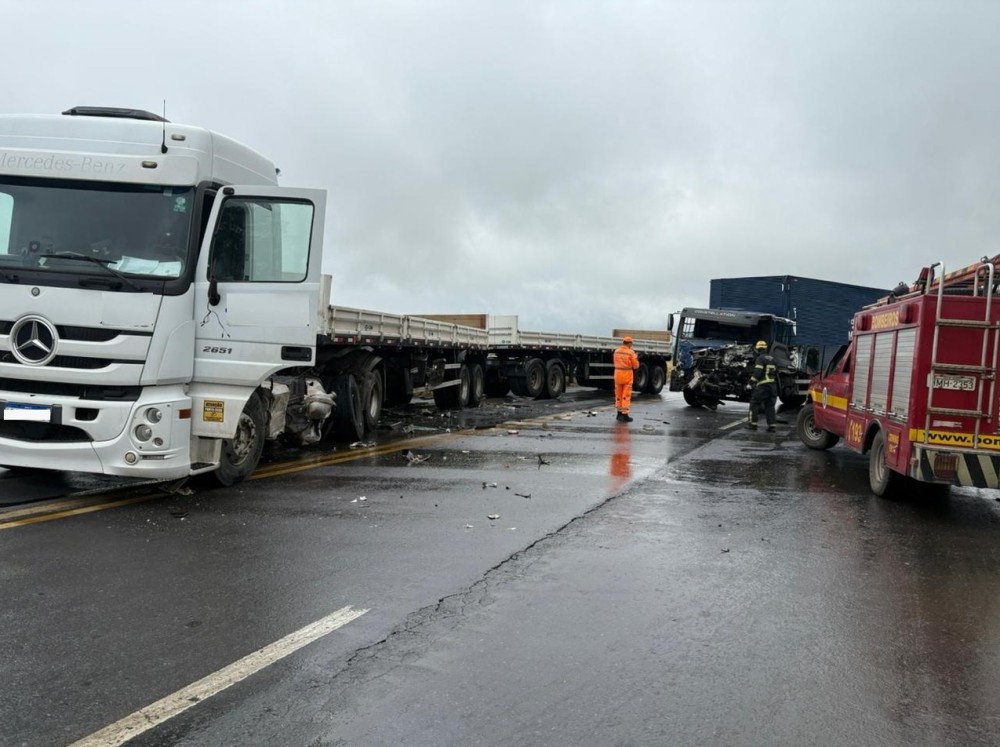 Uma colisão envolvendo um caminhão e uma carreta mobilizou equipes do Corpo de Bombeiros na tarde desta segunda-feira (08/12), na BR-354, altura do km 490, em Formiga. O acidente ocorreu por volta das 12h45 e deixou um homem, de 67 anos, ferido.
