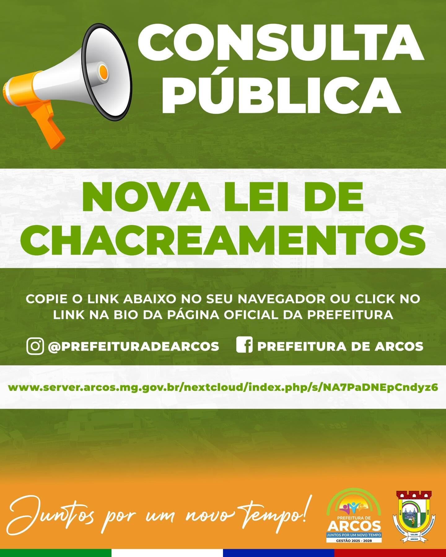 Nesta terça-feira (16/12), a Prefeitura Municipal de Arcos abriu uma consulta pública para receber contribuições da população na elaboração da nova Lei Complementar de Parcelamento do Solo Rural para fins de chacreamento. A medida foi regulamentada pelo Decreto Municipal nº 7.310, publicado em 10 de dezembro de 2025.