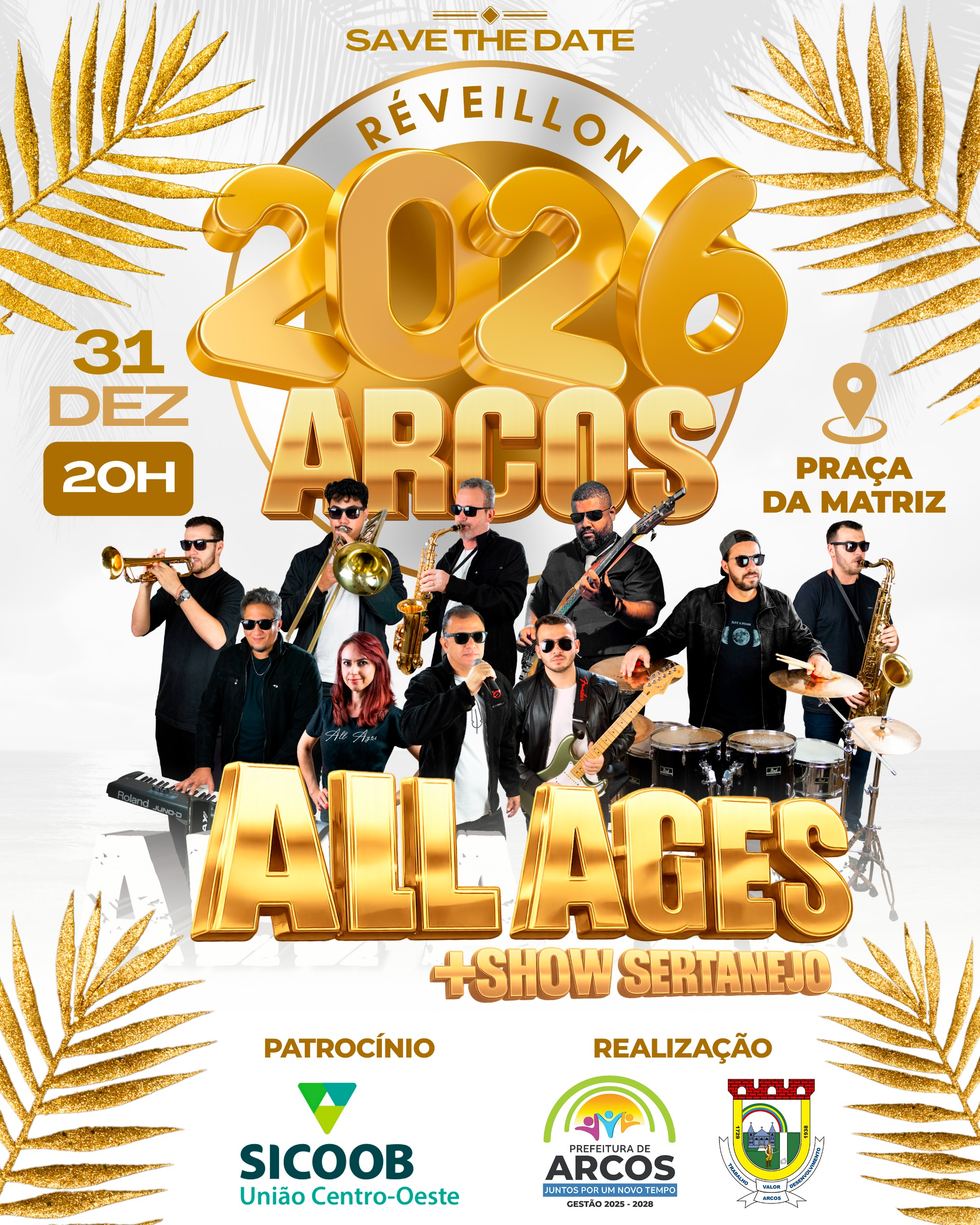 O Réveillon 2026 é uma iniciativa e realização da Prefeitura de Arcos e conta com o patrocínio do Sicoob União Centro-Oeste.