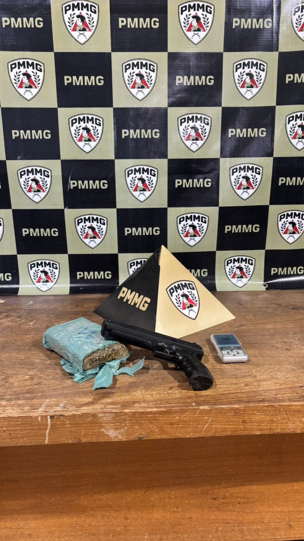 Durante a ação, os militares localizaram em posse do suspeito um tablete de maconha pesando aproximadamente 500 gramas, uma balança de precisão e uma réplica de arma de fogo, materiais frequentemente associados à prática do tráfico de entorpecentes.