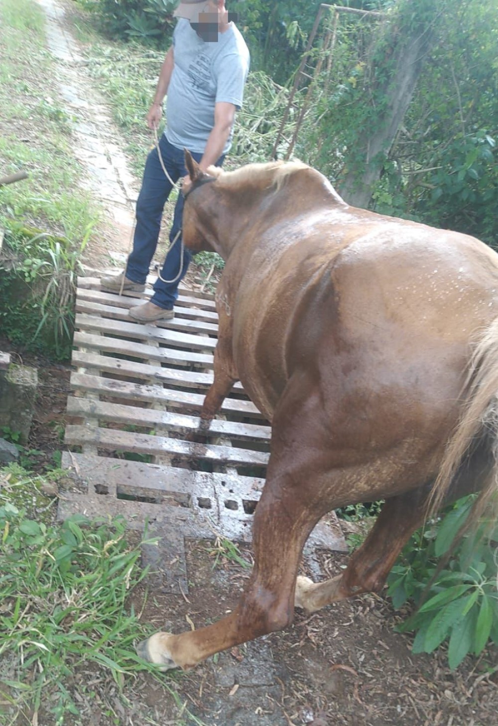 No local, os militares constataram que uma égua havia ficado com as patas dianteiras presas em um mata-burro, impossibilitada de se movimentar e sob risco de ferimentos mais graves.