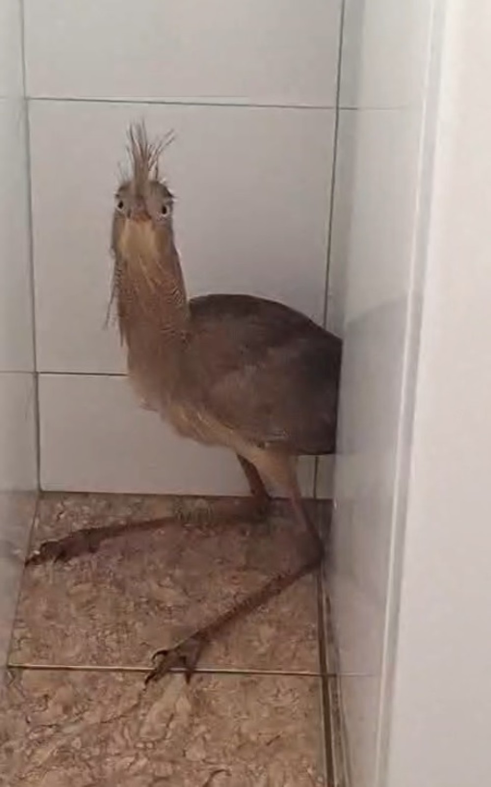 Ao chegarem ao local, os militares constataram que se tratava de uma siriema, ave típica da fauna brasileira, que havia entrado na cozinha do imóvel e se escondia atrás de uma geladeira. Apesar de não apresentar ferimentos aparentes, a situação representava risco potencial tanto para os moradores quanto para o próprio animal.