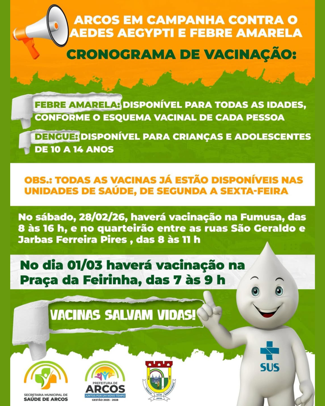A Prefeitura de Arcos, por meio da Secretaria Municipal de Saúde, reforça a campanha de vacinação contra a dengue e a febre amarela, com ações voltadas à prevenção de doenças e à proteção da população.