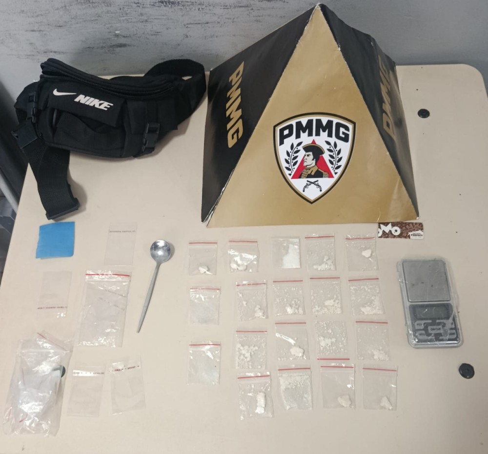 Durante as diligências, os militares localizaram dois suspeitos e uma pochete contendo 17 papelotes de substância análoga à cocaína, uma balança de precisão, uma colher metálica e embalagens plásticas utilizadas para fracionamento de entorpecentes.