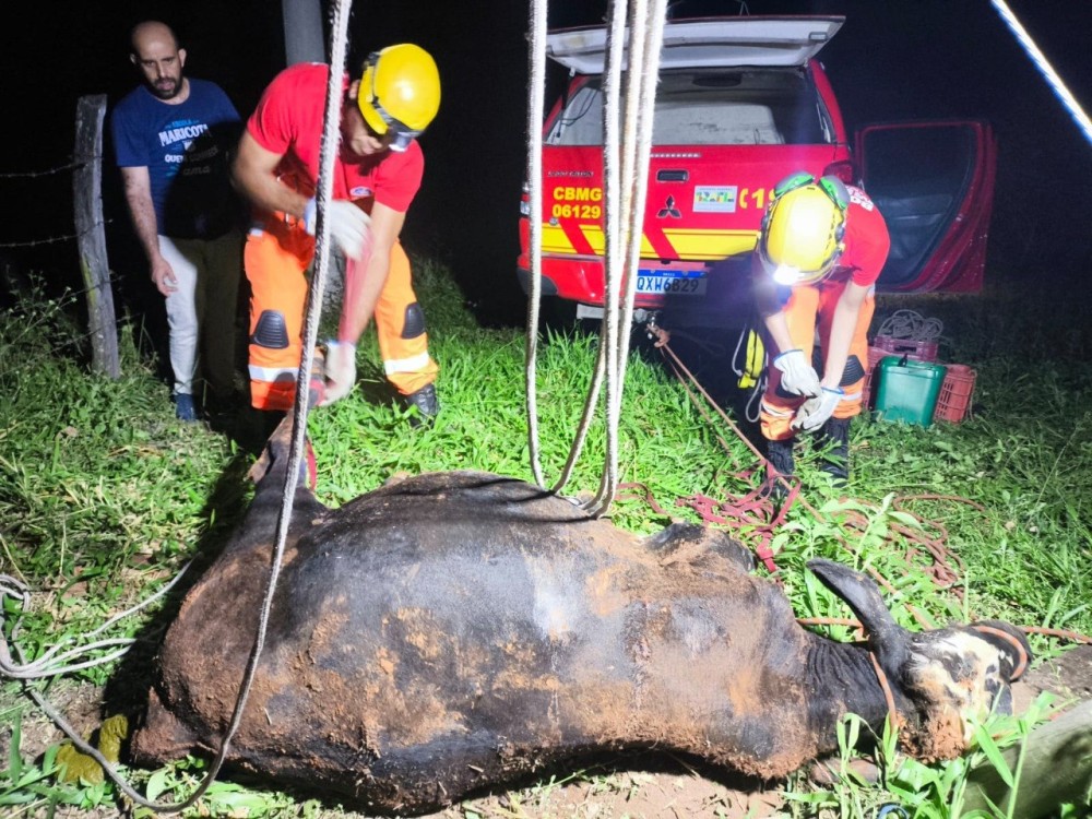 Um bovino foi resgatado pelo Corpo de Bombeiros Militar de Minas Gerais (CBMMG) no fim da tarde desta quarta-feira (1º), na comunidade de Comunheira Jouberte, em Córrego Fundo.