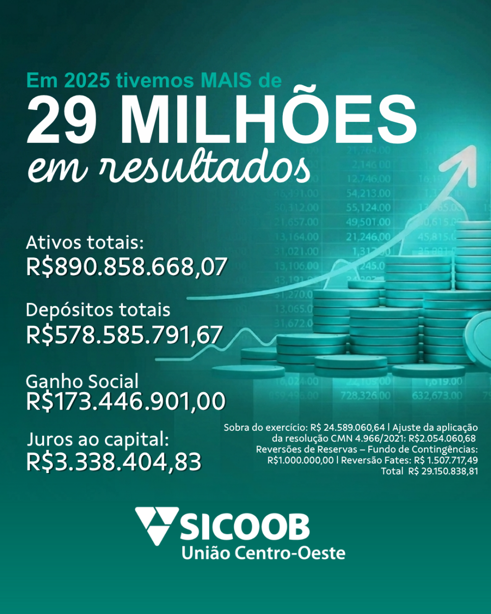 O Sicoob União Centro-Oeste encerrou o ano de 2025 com resultados expressivos, ultrapassando a marca de R$ 29 milhões e consolidando sua atuação como uma das principais instituições financeiras cooperativas da região.