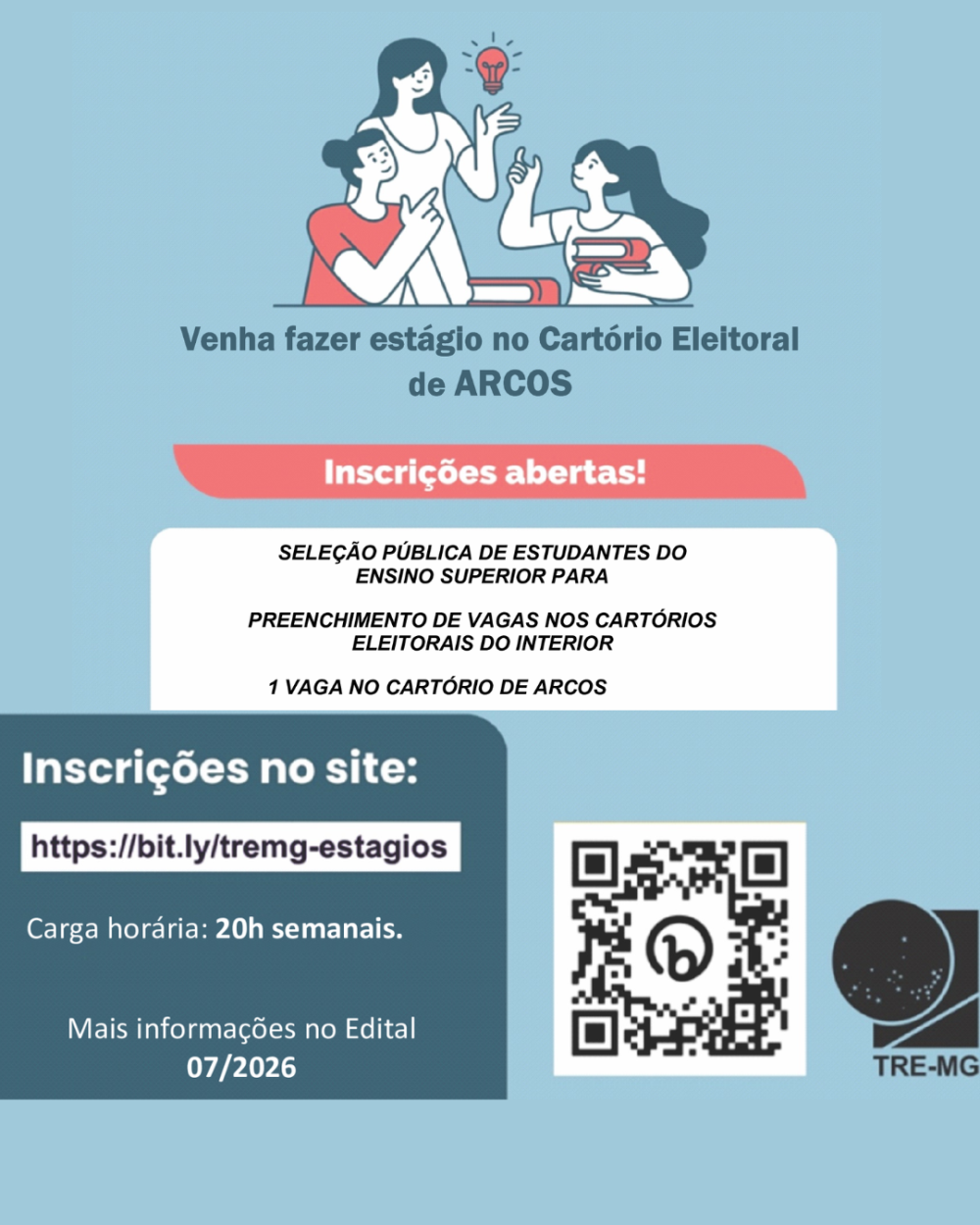 As inscrições devem ser realizadas exclusivamente pelo site do Tribunal Regional Eleitoral de Minas Gerais (TRE-MG), no endereço www.tre-mg.jus.br, até às 23h59 do dia 23 de abril de 2026.