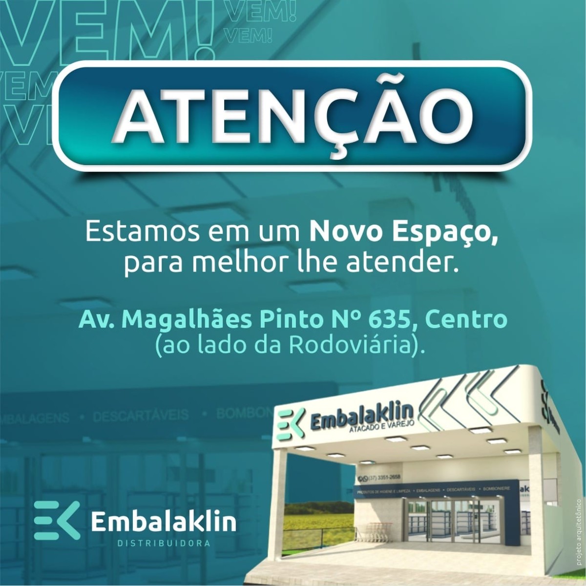Venha e nos faça uma visita e conheça o novo endereço da Embalaklin. Avenida Magalhães Pinto, 635 centro de Arcos, ao lado do Terminal Rodoviário