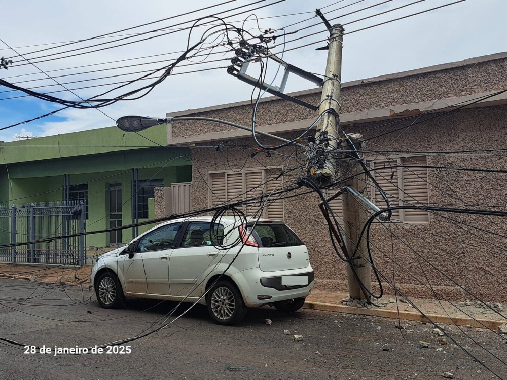 Caminhão transportando retroescavadeira danifica poste em Piumhi